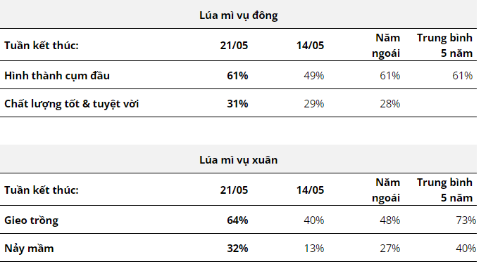 Báo cáo Tiến độ Mùa vụ (Crop Progress) trong tuần kết thúc ngày 21/05/2023 có các số liệu đáng chú ý như sau: