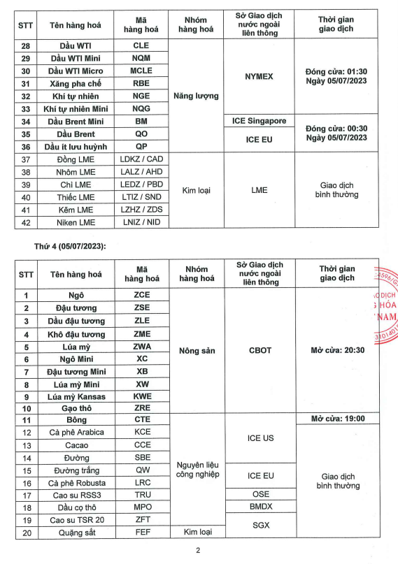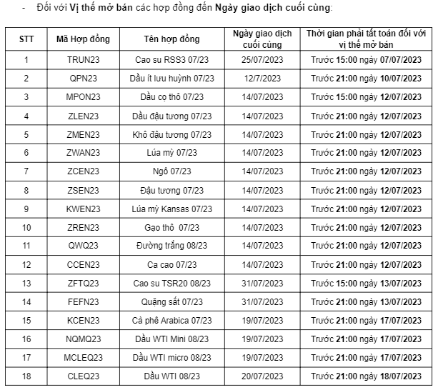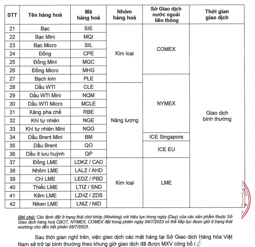 -Giao dịch hàng hóa: Diễn ra bình thường trong các ngày từ ngày 03/07/2023 đến ngày 04/07/2023 theo khung giờ giao dịch đã công bố và theo Thông báo nghỉ giao dịch một số mặt hàng tại MXV ban hành theo từng thời kỳ.