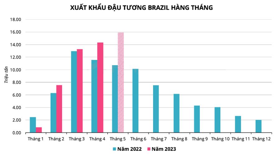 Xuất khẩu đậu tương tháng 05 của Brazil có thể lên tới 15,9 triệu tấn, công ty hàng hải Cargonave dự báo, tăng 155.000 tấn so với ước tính tuần trước của công ty. Nếu được xác nhận, con số này sẽ cao hơn so với mức 14 triệu tấn đậu tương mà Cargonave ước tính Brazil đã xuất khẩu trong tháng 04, đồng thời cũng cao hơn mức 10,3 triệu tấn cùng kỳ năm ngoái.