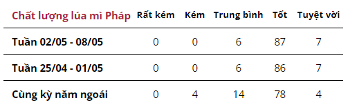 Dữ liệu từ văn phòng nông nghiệp FranceAgriMer cho thấy, khoảng 94% diện tích lúa mì mềm của Pháp, nhà sản xuất ngũ cốc lớn nhất của Liên minh châu Âu (EU), đạt chất lượng tốt/tuyệt vời trong tuần kết thúc ngày 08/05, tăng nhẹ so với mức 94% của một tuần trước đó và cao hơn mức 82% cùng kỳ năm trước. Đây mà mức chất lượng tốt nhất trong ít nhất một thập kỷ qua, cho thấy mưa tiếp tục mang lại lợi ích cho cây trồng.