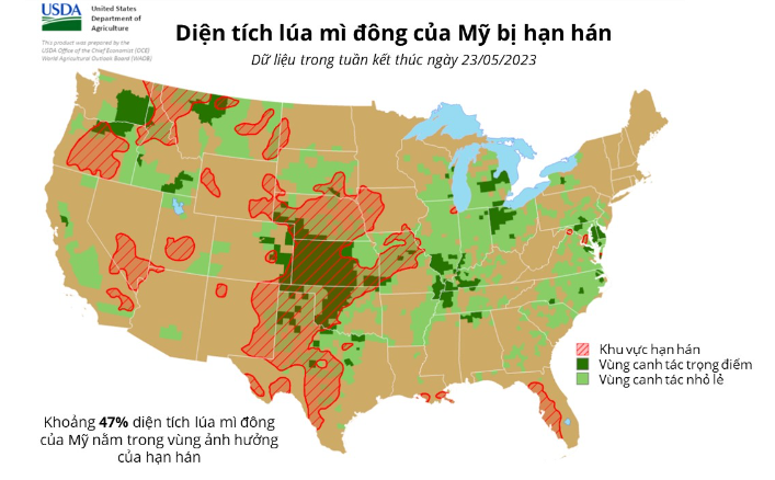 Dữ liệu từ báo cáo Giám sát hạn hán của Bộ Nông nghiệp Mỹ (USDA) cho thấy, tính tới hết ngày 23/05, 47% diện tích lúa mì đông của Mỹ nằm trong vùng bị ảnh hưởng bởi hạn hán. Đây cũng là năm thứ 2 liên tiếp khô hạn đe dọa vụ lúa mì đông của Mỹ.