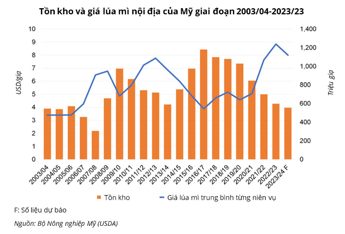 Sản lượng thấp hơn, trong khi nhu cầu tiêu thụ hầu như tăng dần theo từng năm, đã giữ cho tồn kho lúa mì cuối niên vụ của Mỹ luôn ở mức thấp và giá bán nội địa duy trì ở mức cao trong hai niên vụ gần đây.