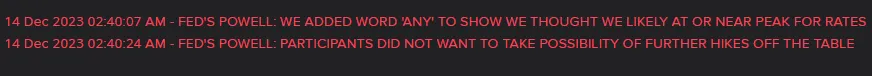 - 14 Dec 2023 02:40:07 AM - FED'S POWELL: WE ADDED WORD 'ANY' TO SHOW WE THOUGHT WE LIKELY AT OR NEAR PEAK FOR RATES