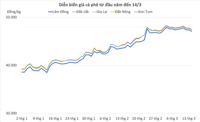 Sau đợt tăng mạnh mạnh trong 2 tháng đầu năm, bước sang tháng 3, giá cà phê bắt đầu chững lại. Tính đến ngày 14/3, giá cà phê tăng 300 - 400 đồng/kg (tương đương khoảng 0,8%) lên 47.100 - 47.400 đồng/kg.