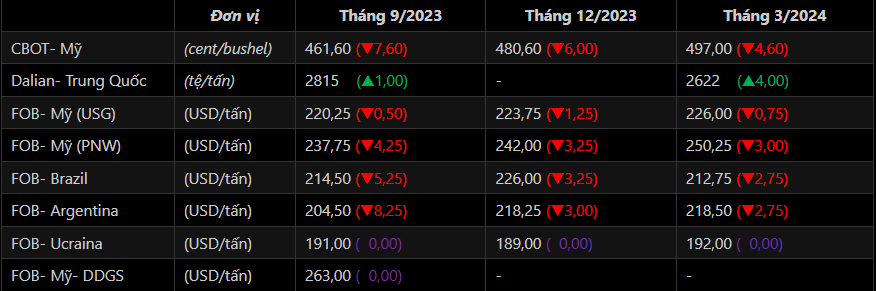 NGÔ: Giá ngô BCOT kỳ hạn tháng 12 nối dài đà giảm sang phiên thứ 2 liên tiếp bất chấp những lo ngại về thời tiết khô hạn tại Mỹ cùng sự hỗ trợ từ thị trường chứng khoán và năng lượng. Đà suy yếu của giá ngô tới từ: (i) Sản lượng ethanol trong tuần kết thúc ngày 25/8 giảm 41 nghìn thùng/ngày so với tuần trước; (ii) Lo ngại xuất khẩu Mỹ trong bối cảnh mực nước sông Mississippi xuống thấp gây khó khăn cho vận chuyển hàng hóa bằng sà lan, làm gia tăng chi phí vận chuyến; (iii) Brazil tiếp tục đẩy mạnh xuất khẩu ngô với lượng xuất khẩu tháng 8 có thể đạt tới 12 triệu tấn và nước này vẫn còn gần 30 triệu tấn ngô khả dụng cho xuất khẩu trong những tháng còn lại của năm 2023; (iv) Tin đồn về việc Trung Quốc có thể đã mua 1 triệu tấn lúa mạch Úc kể từ khi các hạn chế được dỡ bỏ có thể làm giảm nhu cầu nhập khẩu ngô. Chốt phiên giao dịch, giá ngô CBOT kỳ hạn tháng 12 đạt 480,6 cent/giạ, giảm 1,2% so với phiên giao dịch trước đó.