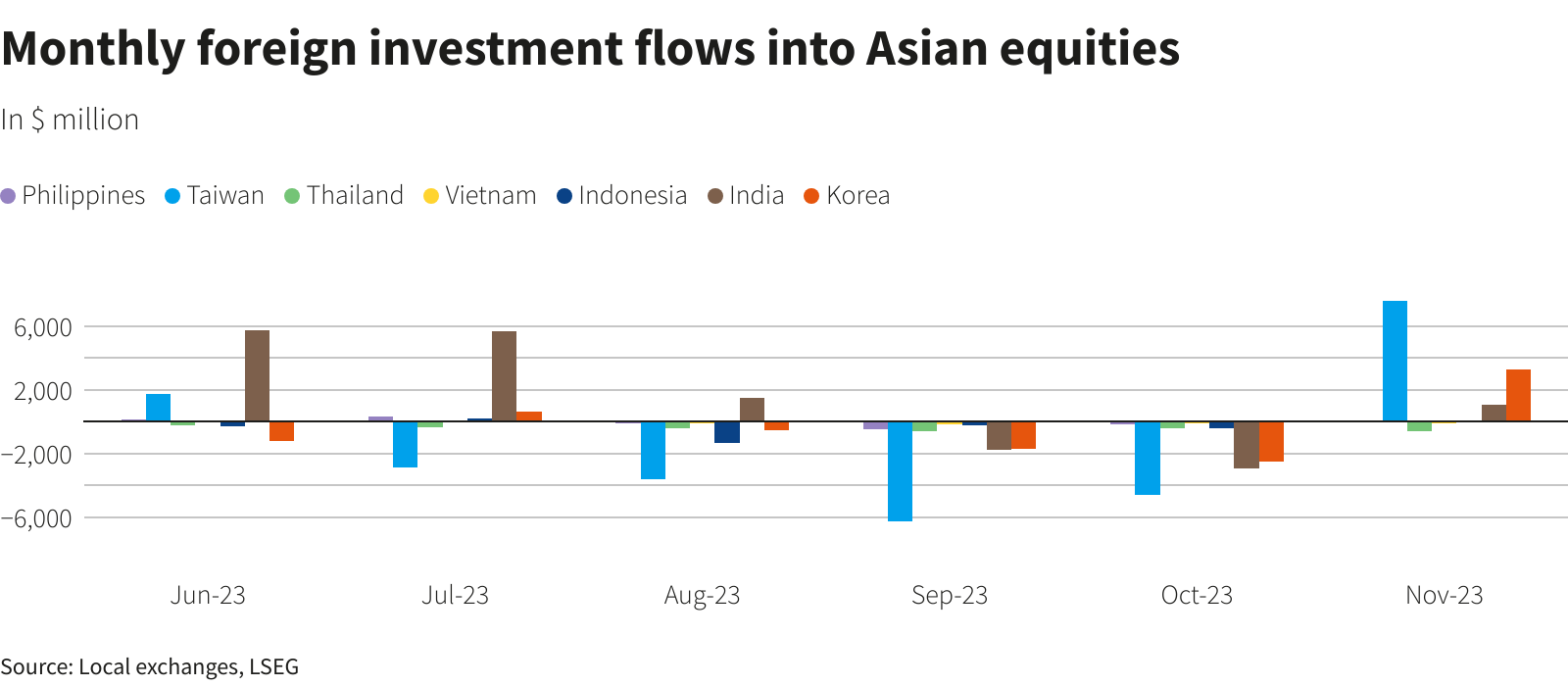 Trong tháng qua, cổ phiếu Đài Loan đã thu hút dòng vốn ngoại vào 7,58 tỷ đô la, cao nhất kể từ ít nhất năm 2008. Cổ phiếu Hàn Quốc thu hút 3,26 tỷ đô la, trong khi cổ phiếu Ấn Độ nhận được dòng vốn ròng vào 1,08 tỷ đô la.