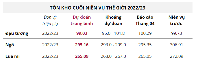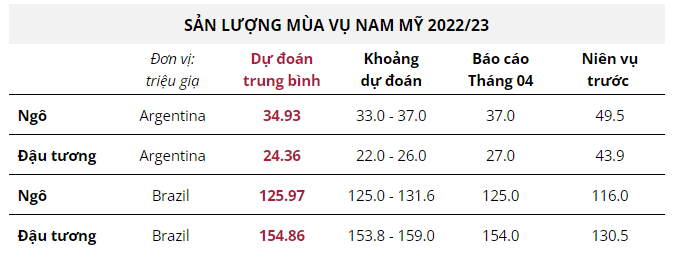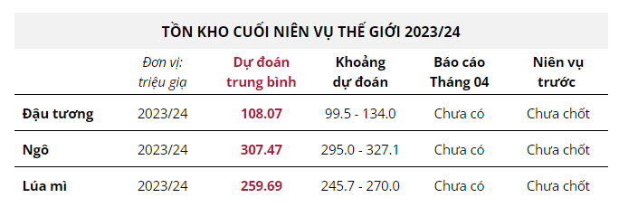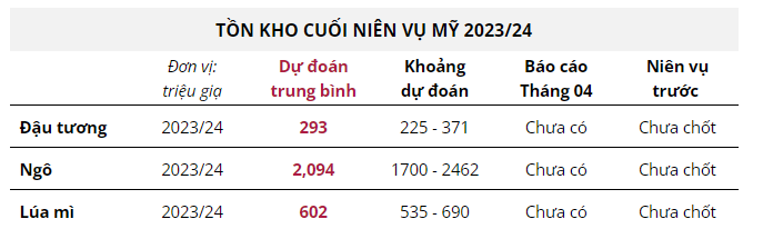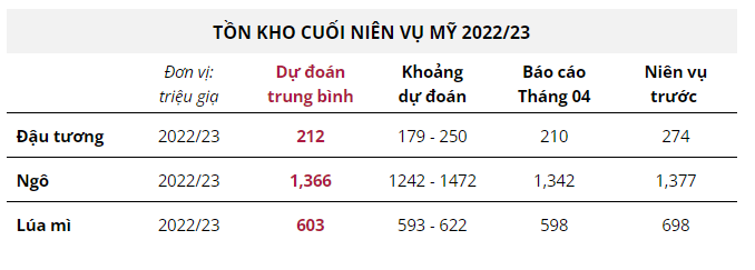 Hãng tin Reuters vừa đưa ra Tổng hợp dự đoán của các Tổ chức lớn trước báo cáo Cung - cầu nông sản thế giới tháng 05 (WASDE) do Bộ nông nghiệp Mỹ (USDA) phát hành vào lúc 23:00 đêm thứ Sáu tuần này 12/05/2023. Dự đoán của Reuters có ý nghĩa rất quan trọng trong giai đoạn trước báo cáo, bởi đây gần như là chỉ báo duy nhất, giúp thị trường nhận định USDA sẽ tăng hay giảm các số liệu sản lượng, tồn kho trong báo cáo tới.
