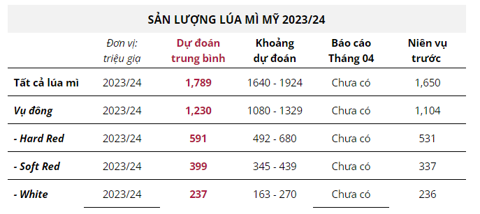 Cũng trong báo cáo này, USDA sẽ đưa ra các dự báo đầu tiên về tồn kho và sản lượng lúa mì Mỹ niên vụ 2023/24, cụ thể như sau: