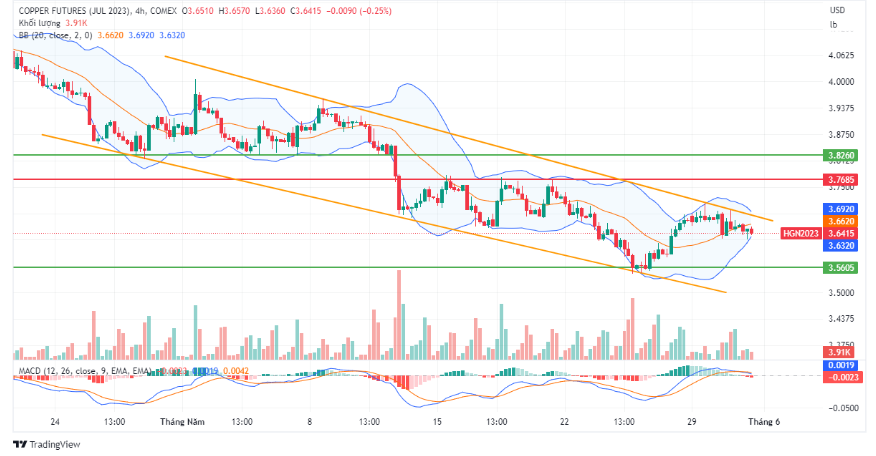 Về mặt kĩ thuật, trên khung H4, giá giảm sau khi chạm kháng cự là cạnh trên của kênh xu hướng giảm. Tuy nhiên giá đang di chuyển trong dải Bollinger Band thu hẹp và volume yếu, cho thấy tâm lý thận trọng của thị trường. Dự báo giá có thể tiếp tục giằng co, tới phiên tối, nếu dữ liệu tích cực hơn dự báo, giá đồng có thể giảm về 3,60 USD.
