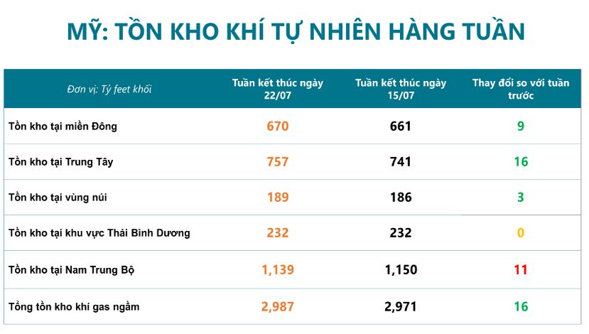 Theo báo cáo tồn kho của Cơ quan Thông tin Năng lượng Mỹ (EIA), tổng tồn kho khí gas tự nhiên tại các kho chứa ngầm của Mỹ tăng 16 tỷ feet khối lên 2,987 tỷ feet khối trong tuần kết thúc ngày 22/07.