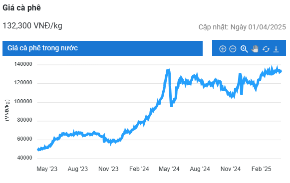 Khảo sát lúc 11h00 sáng ngày 1/4, giá cà phê tại khu vực Tây Nguyên giảm trở lại từ 600 – 800 đồng/kg so với ngày hôm qua, xuống còn 131.200 – 132.300 đồng/kg.