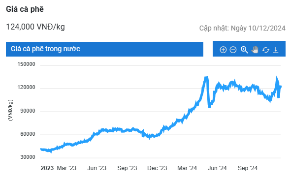 Khảo sát lúc 11h00 sáng ngày 10/12, giá cà phê tại khu vực Tây Nguyên dao động ở mức 123.500 – 124.000 đồng/kg, tăng 2.000 – 2.500 đồng/kg so với hôm qua.