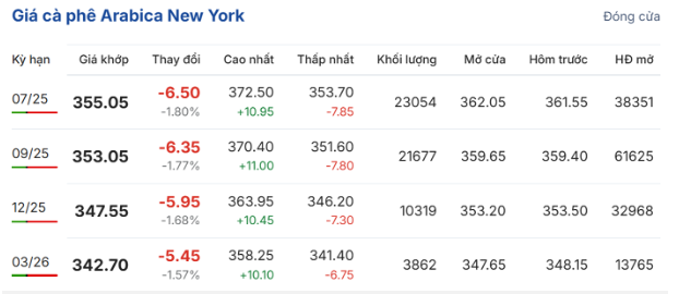 Trên Sàn giao dịch New York, giá cà phê arabica giao kỳ hạn tháng 7/2025 cũng giảm nhưng với biên độ hẹp hơn, giảm 1,8% (6,5 US cent/pound), về mốc 355,05 US cent/pound; hợp đồng giao kỳ hạn tháng 9 giảm 1,77% (6,35 US cent/pound), chốt ở mốc 353,05 US cent/pound.