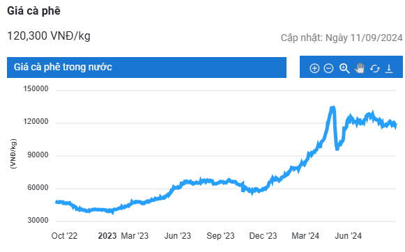 Tại tỉnh Đắk Nông và tỉnh Gia Lai, giá cà phê robusta nhân xô đang được các đại lý thu mua ở mức cao nhất là 120.300 đồng/kg.