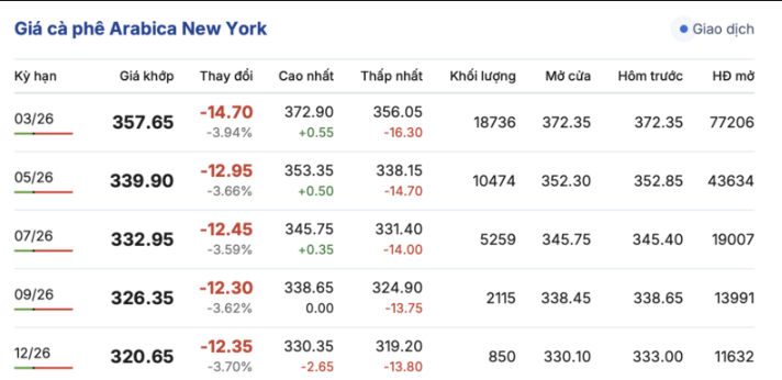 Tương tự, trên sàn New York, giá cà phê Arabica cũng ghi nhận phiên bán tháo ồ ạt trong các kỳ giao hàng. Cụ thể, kỳ giao tháng 3/2026 giảm mạnh 14,7 cent/lb, xuống mức 357,65 cent/lb. Cùng chiều giảm mạnh, hợp đồng giao tháng 12/2026 giảm 12,35 cent/lb, đạt mức 320,65 cent/lb.