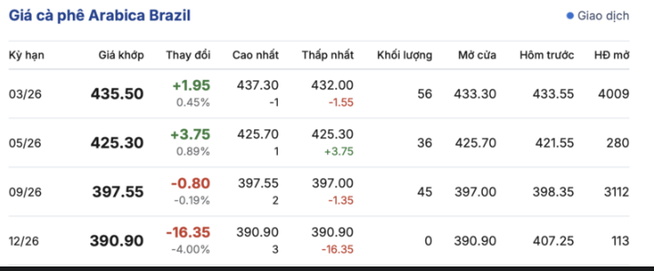 Kết thúc phiên giao dịch gần nhất, cà phê Arabica Brazil ghi nhận biến động trái chiều trong các kỳ giao hàng. Cụ thể: kỳ hạn tháng 3/2026 đạt mức 435,5 cent/lb, tăng nhẹ 1,95 cent/lb so với hôm qua. Trái lại, kỳ giao hàng tháng 12/2026 giảm mạnh 16,35 cent/lb, đạt mức 390,9 cent/lb.