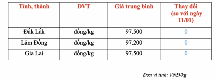 Giá cà phê hôm nay 12/1: Không có biến động mới. Hiện cà phê trong nước giao dịch từ 97.200 - 97.500 đồng/kg tại các vùng trọng điểm khu vực Tây Nguyên.