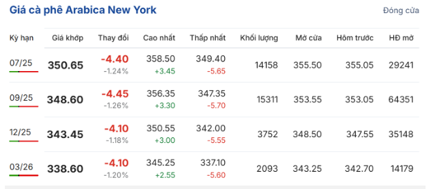 Tương tự, trên Sàn giao dịch New York, giá cà phê arabica giao kỳ hạn tháng 7/2025 cũng giảm 1,24% (4,4 US cent/pound), đạt 350,65 US cent/pound; hợp đồng giao kỳ hạn tháng 9 giảm 1,26% (4,45 US cent/pound), về mức 348,6 US cent/pound.