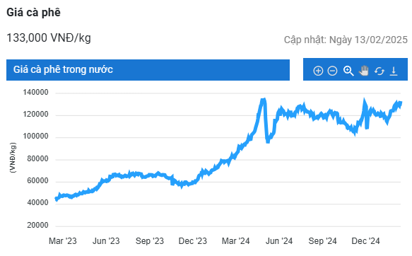 Trong phiên giao dịch kết thúc vào sáng ngày 13/2, giá cà phê bật tăng mạnh trên cả hai sàn giao dịch và thiết lập các cột mốc kỷ lục mới. Giá cà phê trên thị trường nội địa Việt Nam theo đó cũng tăng 2.000 - 2.200 đồng/kg, chạm mốc 133.000 đồng/kg.