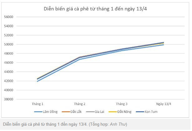 Giá cà phê hôm nay (13/4) tại thị trường trong nước tiếp tục tăng 100 đồng/kg. Trong đó, 50.400 đồng/kg là mức giao dịch cao nhất trong các địa phương được khảo sát.
