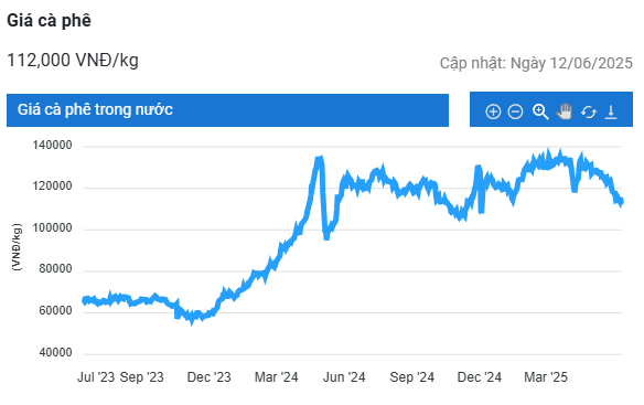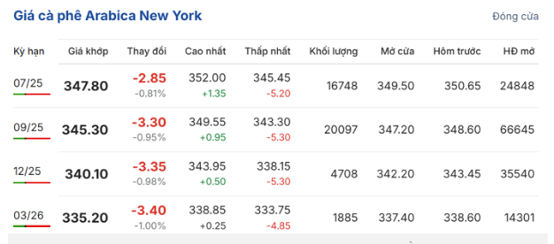 Trên Sàn giao dịch New York, giá cà phê arabica giao kỳ hạn tháng 7/2025 tiếp tục giảm 0,81% (2,85 US cent/pound), xuống còn 347,8 US cent/pound; hợp đồng giao kỳ hạn tháng 9 giảm 0,95% (3,3 US cent/pound), về mức 345,3 US cent/pound.