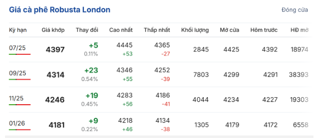 Trên sàn giao dịch London, giá cà phê trực tuyến robusta hợp đồng giao kỳ hạn tháng 7/2025 đóng cửa sáng này ở mức 4.397 USD/tấn, tăng nhẹ 0,11% (5 USD/tấn) so với phiên giao dịch trước; hợp đồng giao kỳ hạn tháng 9 tăng 0,54% (23 USD/tấn), lên mức 4.314 USD/tấn.