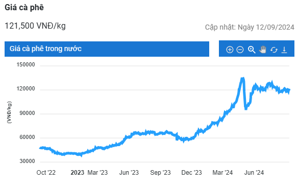 Cụ thể, giá cà phê robusta nhân xô tại tỉnh Đắk Lắk và tỉnh Đắk Nông đang được đại lý thu mua ở mức cao nhất là 121.500 đồng/kg, tăng 1.200 đồng/kg.