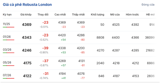 Trong phiên giao dịch ngày 13/11, giá cà phê trực tuyến robusta hợp đồng giao kỳ hạn tháng 11/2025 trên sàn London giảm nhẹ 0,51% (23 USD/tấn) so với phiên giao dịch trước, đạt 4.369 USD/tấn. Hợp đồng giao kỳ hạn tháng 1/2026 giảm 0,52% (23 USD/tấn), còn 4.343 USD/tấn.