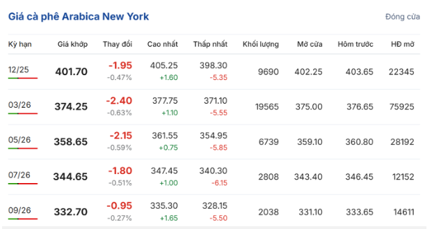Trên sàn giao dịch New York, giá cà phê arabica giao kỳ hạn tháng 12/2025 cũng giảm nhẹ 0,47% (1,95 US cent/pound) so với ngày hôm trước, xuống còn 401,7 US cent/pound. Hợp đồng giao tháng 3/2026 giảm 0,63% (2,4 US cent/pound), ở mức 374,25 US cent/pound.
