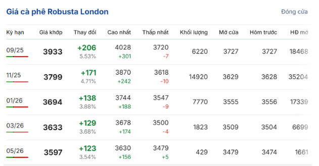 Trên sàn giao dịch London, giá cà phê trực tuyến robusta hợp đồng giao kỳ hạn tháng 9/2025 đóng cửa phiên giao dịch ngày 12/8 ở mức 3.933 USD/tấn, tăng vọt 5,53% (206 USD/tấn) so với phiên giao dịch trước. Hợp đồng giao kỳ hạn tháng 11/2025 tăng 4,71% (171 USD/tấn), đạt 3.799 USD/tấn.