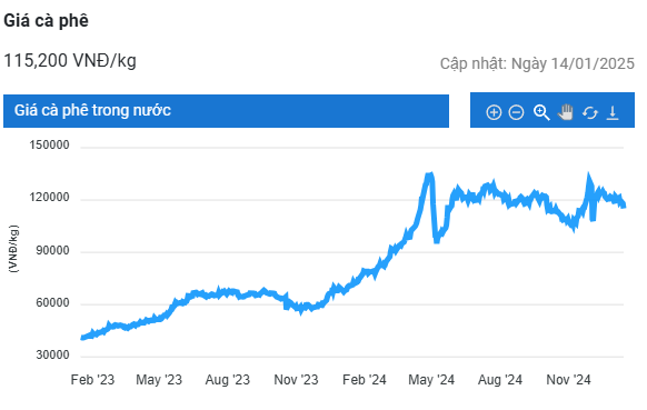 Giá cà phê hôm nay (15/1) đồng loạt giảm trên cả hai sàn giao dịch, với robusta giảm phiên thứ ba liên tiếp xuống dưới 4.900 USD/tấn và arabica giảm 4 US cent/pound. Tương tự, giá cà phê trên thị trường nội địa Việt Nam cũng giảm 700 – 1.000 đồng/kg, xuống chỉ còn 114.000 – 114.500 đồng/kg.