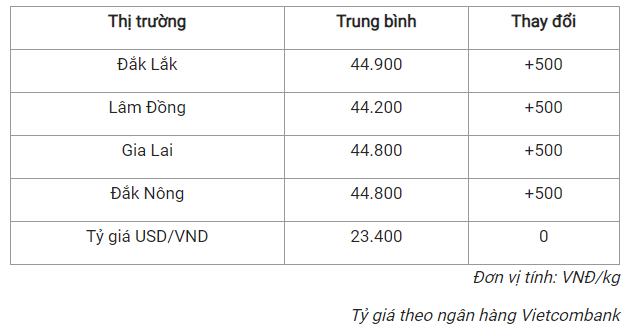 Tương tự, tỉnh Đắk Lắk cũng điều chỉnh giá cà phê lên mức 44.900 đồng/kg trong hôm nay.