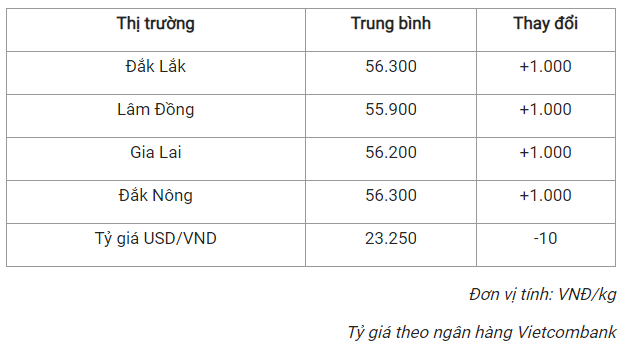 Theo ghi nhận, các địa phương đang thu mua cà phê với giá trong khoảng 55.900 - 56.300 đồng/kg.