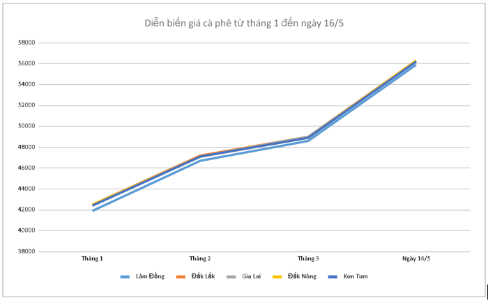 Giá cà phê hôm nay (16/5) tại thị trường trong nước tăng 1.000 đồng/kg. Hiện, mức giao dịch cao nhất trong các địa phương được khảo sát là 56.300 đồng/kg, tiếp tục được ghi nhận tại hai tỉnh Đắk Lắk và Đắk Nông.