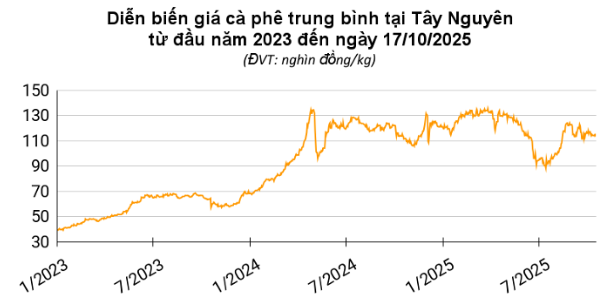 Ghi nhận lúc 11h00 sáng ngày 17/10, giá cà phê tại khu vực Tây Nguyên tiếp tục tăng thêm 800 – 1.000 đồng/kg so với ngày hôm trước, dao động trong khoảng 114.500 - 1154.500 đồng/kg.