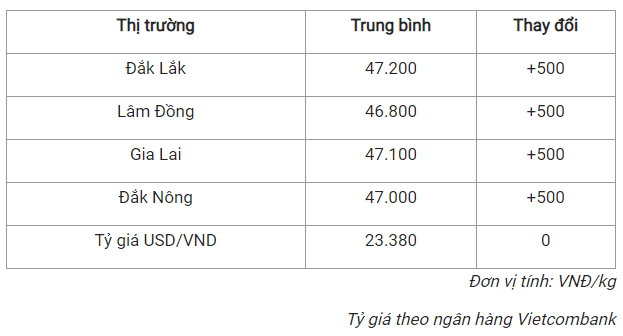 Ghi nhận cho thấy, các địa phương đang thu mua cà phê với giá trong khoảng 46.800 - 47.200 đồng/kg.