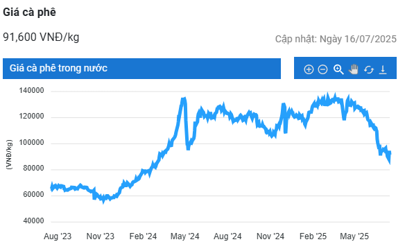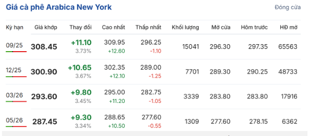 Trên sàn giao dịch New York, giá cà phê arabica giao kỳ hạn tháng 9/2025 tăng tới 3,73% (11,1 US cent/pound), đạt 308,45 US cent/pound. Hợp đồng giao kỳ hạn tháng 11/2025 tăng 3,67% (10,65 US cent/pound), lên mức 300,9 US cent/pound.