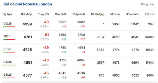 Đóng cửa phiên giao dịch ngày 16/9, trên sàn giao dịch London, giá cà phê trực tuyến robusta hợp đồng giao kỳ hạn tháng 11/2025 đạt 4.781 USD/tấn, quay đầu giảm 1,26% (61 USD/tấn) so với phiên giao dịch trước. Hợp đồng tháng 1/2026 cũng giảm 1,26% (49 USD/tấn) còn 4.725 USD/tấn.
