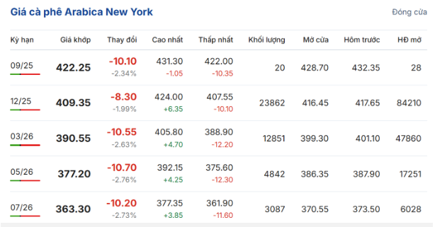 Trên sàn giao dịch New York, giá cà phê arabica giao kỳ hạn tháng 12/2025 giảm mạnh hơn, với mức giảm 1,99% (8,3 US cent/pound) so với phiên trước đó, đạt 409,35 US cent/pound. Hợp đồng giao tháng 3/2026 giảm 2,63% (10,55 US cent/pound), đạt 390,5 US cent/pound.