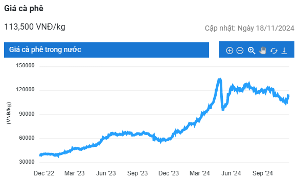 Sáng ngày 18/11, giá cà phê trong nước điều chỉnh tăng 300 - 400 đồng/kg, dao động trong khoảng 113.100 - 113.700 đồng/kg. Tháng 10 vừa qua, giá xuất khẩu bình quân cà phê của Việt Nam đạt kỷ lục 5.720 USD/tấn, tăng 2,4% so với tháng trước và tăng 59% so với cùng kỳ năm ngoái.