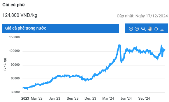 Tương tự, giá cà phê tại tỉnh Đắk Lắk cũng giảm 800 đồng/kg, xuống còn 124.000 đồng/kg.