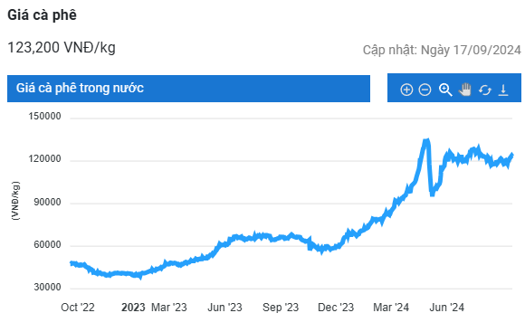Tính đến sáng ngày 18/9, giá cà phê robusta hợp đồng giao tháng 11 trên sàn Lodon cán mốc 5.303 USD/tấn, tăng 1,1% (tương ứng 57 USD/tấn) so với phiên giao dịch trước và là mức cao nhất đạt được kể từ trước đến nay; hợp đồng giao tháng 1/2025 cũng tăng 1,3%, lên mức 5.040 USD/tấn.