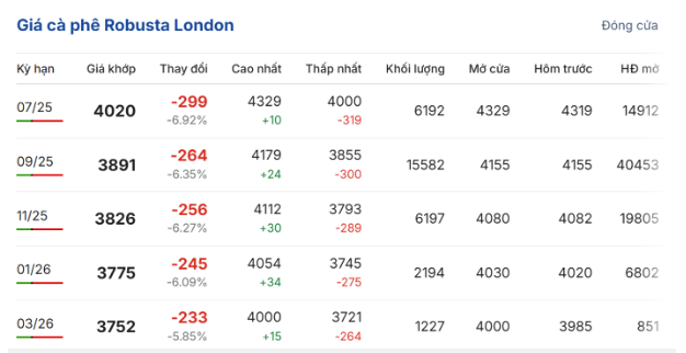 Trên sàn giao dịch London, giá cà phê trực tuyến robusta hợp đồng giao kỳ hạn tháng 7/2025 đóng cửa ở mức 4.020 USD/tấn, tiếp tục giảm mạnh 6,92% (299 USD/tấn) so với phiên giao dịch trước; hợp đồng giao kỳ hạn tháng 9 cũng giảm tới 6,35% (264 USD/tấn), chỉ còn 3.891 USD/tấn.
