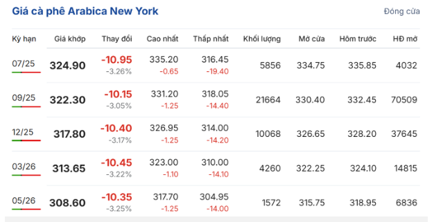 Trên Sàn giao dịch New York, giá cà phê arabica giao kỳ hạn tháng 7/2025 cũng giảm 3,26% (10,95 US cent/pound), xuống còn 324,9 US cent/pound; hợp đồng giao kỳ hạn tháng 9 giảm 3,05% (10,5 US cent/pound), đạt 332,3 US cent/pound.