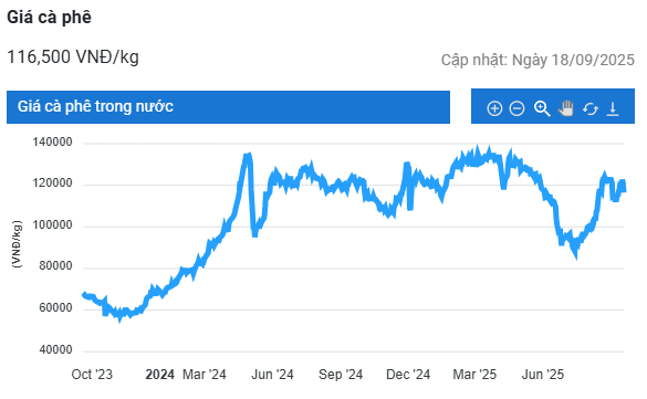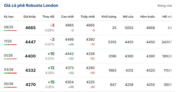 Đóng cửa phiên giao dịch ngày 18/9, trên sàn giao dịch London, giá cà phê trực tuyến robusta hợp đồng giao kỳ hạn tháng 11/2025 đạt 4.447 USD/tấn, giảm nhẹ 0,07% (3 USD/tấn) so với phiên giao dịch trước. Tuy nhiên, hợp đồng tháng 1/2026 tăng 0,23% (10 USD/tấn) lên mức 4.400 USD/tấn.