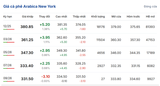 Trên sàn giao dịch New York, giá cà phê arabica giao kỳ hạn tháng 12/2025 tăng 1,38% (5,2 US cent/pound) so với phiên trước đó, lên mức 380,85 US cent/pound. Hợp đồng giao tháng 3/2026 tăng 1,11% (3,95 US cent/pound), đạt 361,25 US cent/pound.
