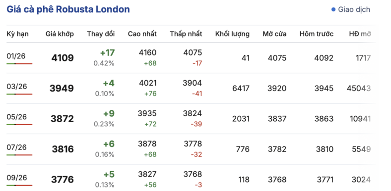 Kết thúc phiên giao dịch gần nhất, giá cà phê Robusta tại London tiếp tục tăng nhẹ đồng loạt trong các kỳ giao hàng, tuy nhiên mức tăng không đáng kể. Cụ thể, kỳ giao tháng 1/2026 tăng 17 USD/tấn, lên mức 4109 USD/tấn. Hợp đồng giao kỳ hạn tháng 9/2026 tăng 5 USD/tấn, lên mức 3776 USD/tấn.