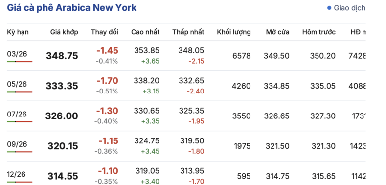 Trái ngược, trên sàn New York, giá cà phê Arabica lại ghi nhận giảm nhẹ liên tục trong các kỳ giao hàng. Cụ thể, kỳ giao tháng 3/2026 giảm nhẹ 1,45 cent/lb, đạt mức 348,75 cent/lb. Hợp đồng giao tháng 12/2026 cũng giảm nhẹ 1,1 cent/lb, đạt mức 314,55 cent/lb.