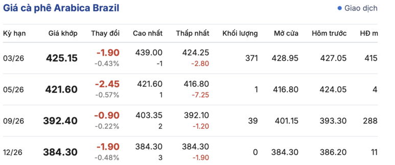 Kết thúc phiên giao dịch gần nhất, giá cà phê Arabica Brazil cũng giảm liên tục so với phiên giao dịch trước. Cụ thể: kỳ giao hàng tháng 3/2026 đạt mức 425,15 cent/lb, giảm nhẹ 1,9 cent/lb so với hôm qua. Trong khi đó, kỳ giao hàng tháng 12/2026 cũng giảm nhẹ 1,9 cent/lb, đạt mức 384,3 cent/lb.