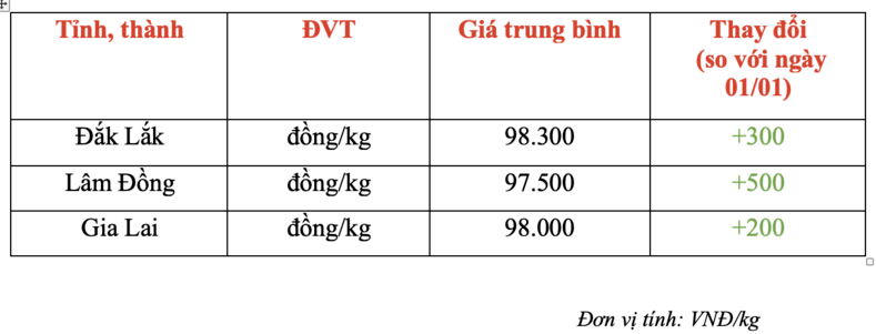 Giá cà phê nội địa hôm nay (02/01) tiếp đà tăng giá từ 200 - 500 đồng/kg. Hiện cà phê trong nước dao dịch từ 97.500 - 98.300 đồng/kg tại các vùng trọng điểm khu vực Tây Nguyên.